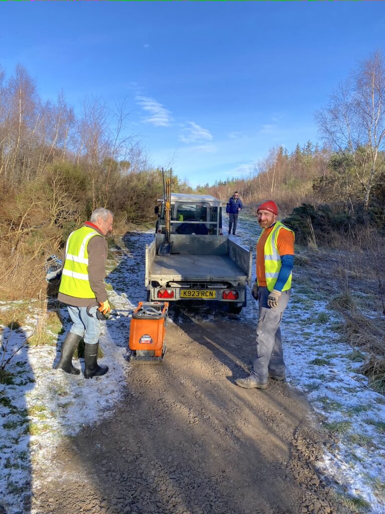 - The dip in the path just south of the Mannachie flood alleviation bund was infilled with 2 tonnes of quarry material and compacted with the wacker plate. An off-let was also dug at the lowest point to allow water to drain away from the path.