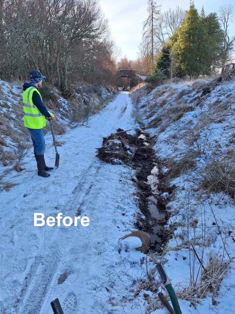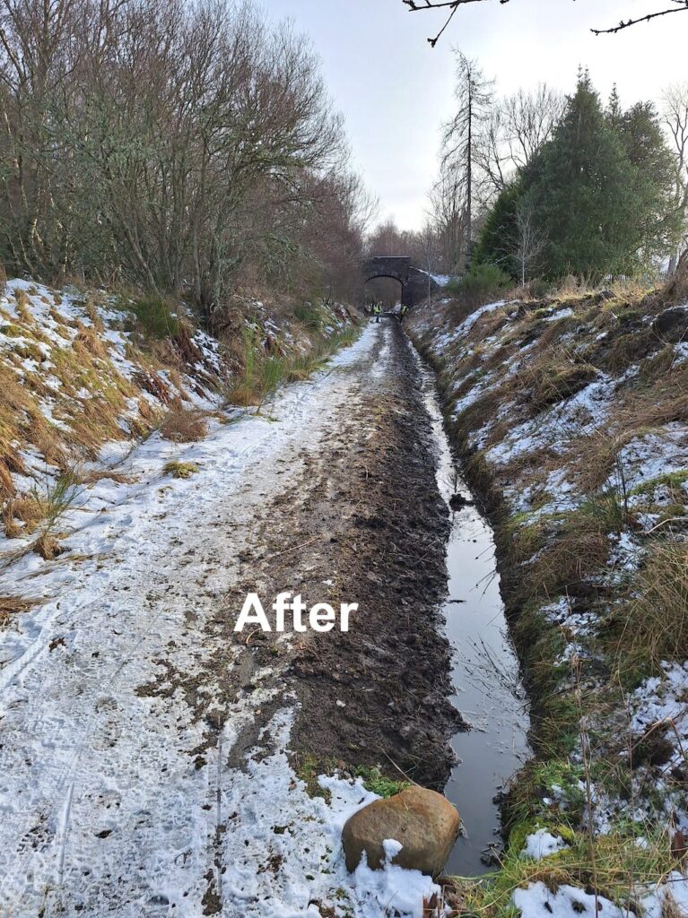 - The choked east side drainage ditch north of the Dunphail Breathing Place was cleaned out by hand and spoil arisings dumped on top of the cutting embankment.